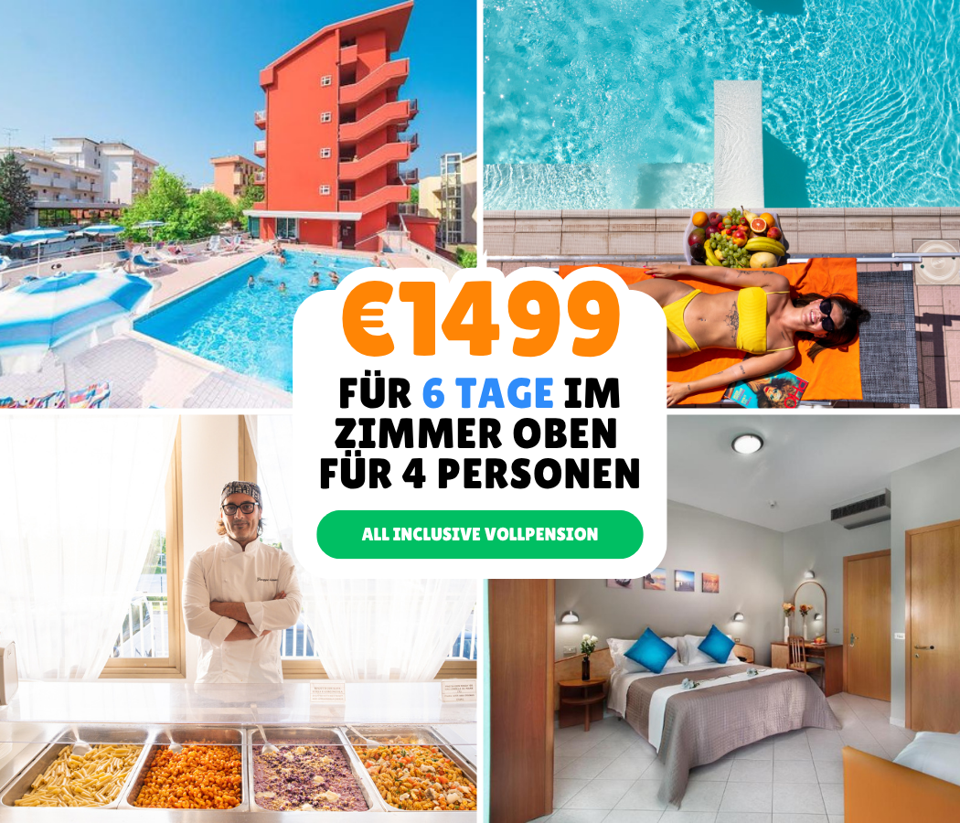 Melden Sie sich anBieten Sie vom 3. bis 9. August 6 Tage Vollpension für 1499 € für bis zu 4 Personen in einem Zimmer an